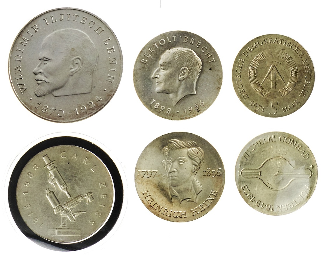 East Germany. Deutsche Demokratische Republik. Commemorative Grouping. 20 Mark, 1988 - Carl Zeiss. KM 124; 10 Mark - 1972 Heinrich Heine, 1973 Bertolt Brecht, KM 39, 45. Choice BU; 5 Mark - 1970 Rontgen, 1971 Kepler. Unc.; also 1970 DDR Lenin Medal. (6)
