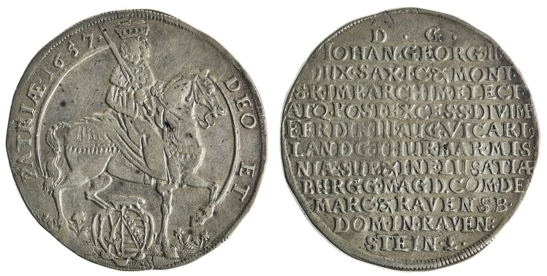 German States. Saxony. Johann Georg II (1656-1680). Taler, 1657. On the Death of HRE Ferdinand III. The Elector on horseback right, holding sword on shoulder, rev. Twelve-line legend. D.7630, KM 481. Some scratches upper obverse field. Light gray. Very Fine. Ex Ponterio Sale, September 16-17, 2008, lot 223.