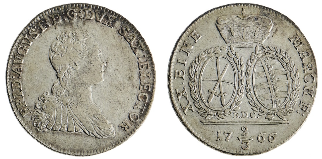 German States. Saxony - Albertine. Electorate. Friedrich August III (1763-1806). 2/3 Taler, 1766 EDC. Peruked, draped and cuirassed bust right, rev.Two wreathed oval arms crowned, date and fractional value below. KM 981. Good Very Fine.