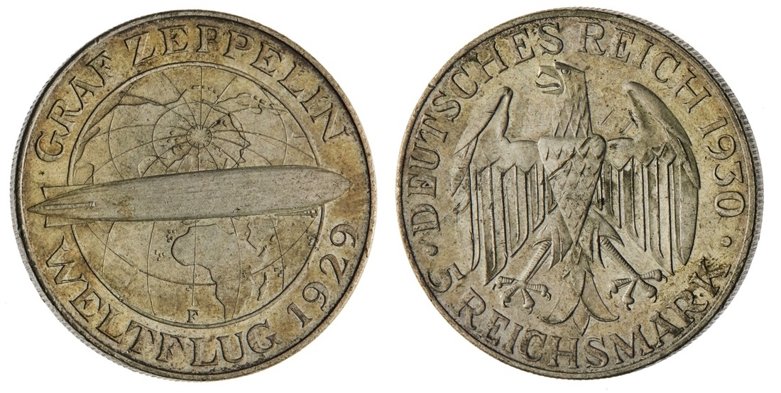 Germany. Weimar. 5 Reichsmark, 1930 F. Graf Zeppelin Flight. Zeppelin flying right over globe. Shallow scrape across eagle's breast. KM 68. About Uncirculated.