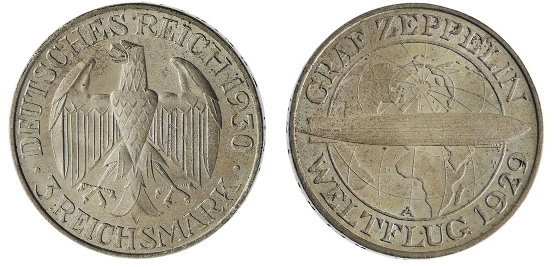 Germany. Weimar. 3 Reichsmark, 1930 A. Graf Zeppelin Flight. The Zeppelin over the globe, rev. Weimar eagle. KM 67. Satiny. Brilliant Uncirculated.