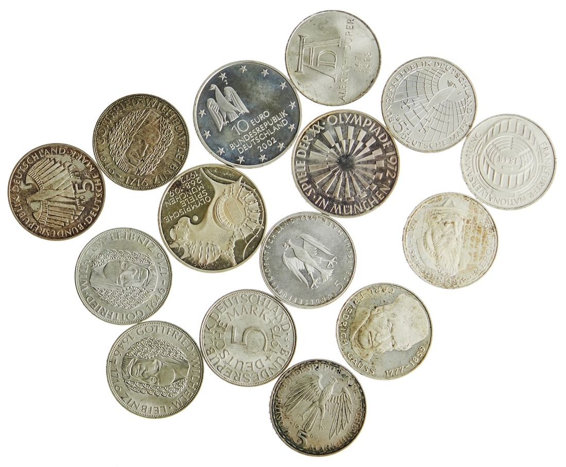 Germany. Bundesrepublik. Lot of modern Commemoratives. 5 Deutsche Mark - 1966 Leibniz (3), 1969 Mercator (3), 1970 Beethoven (2), 1971 Empire, Dürer, 1973 Copernicus, Frankfurt Parliament (2), 1974 Constitutional Law, Kant, 1977 Gauss and v. Kleist; copper-nickel - 1980 Köln, 1981 v. Stein, 1984 Customs Union (2); 10 Deuts che Mark - Proof 1972D (spiral) and G (stadium aerial view) Olympics; 10 Euro, 2002 Kassel; also regular issue 5 DM, 1973 F; and DDR. 20 Mark, 1971. Heinrich Mann. One Mercator, EF with hairlines; the rest Unc-BU. (26)