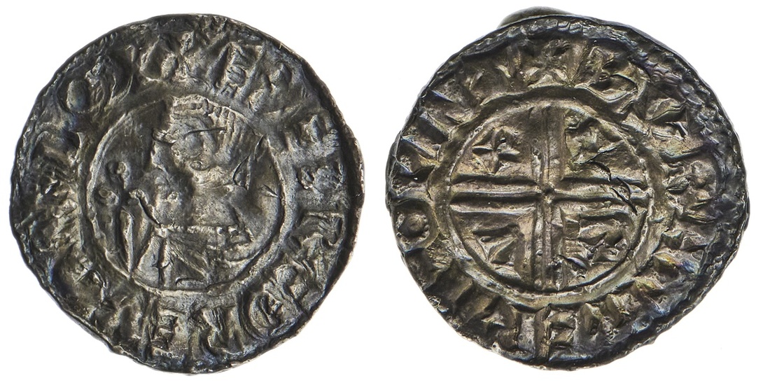 England. Late Anglo-Saxon. Aethelred II (978-1016). Crux-type Penny. Winchester, moneyer: Brihtmaer. 1.7 gms. Bare-headed bust left, scepter before, +AEÐELREDREX ANGLOR, rev. Short cross voided with CRVX in angles, +BYRHTMAER M-O PINT. N.770, S.1148. Flan a bit wobbled from strike. Light pecks. Deep tone. Very Fine.