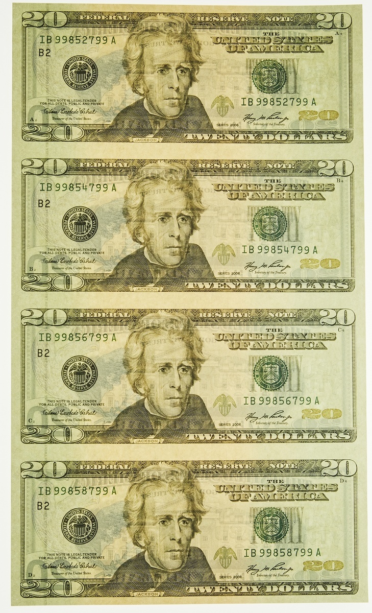 Fr.2093-B. Uncut Sheet of four 2006 $20 Federal Reserve Notes. New York. Crisp Uncirculated.