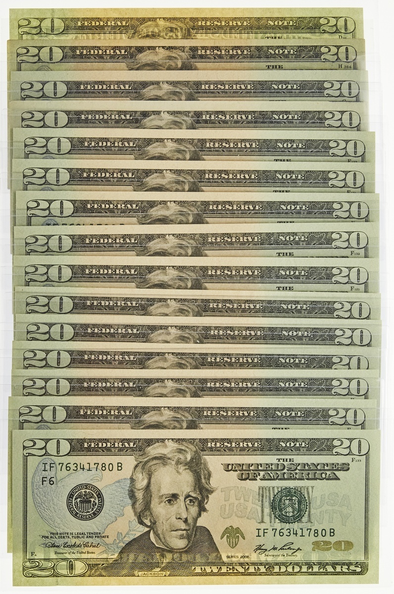 2006 $20 Federal Reserve Notes, Richmond and Atlanta. Mostly DC printings. Includes: E (11), E* (3), F (49), F* (4). VF-CU. [67]