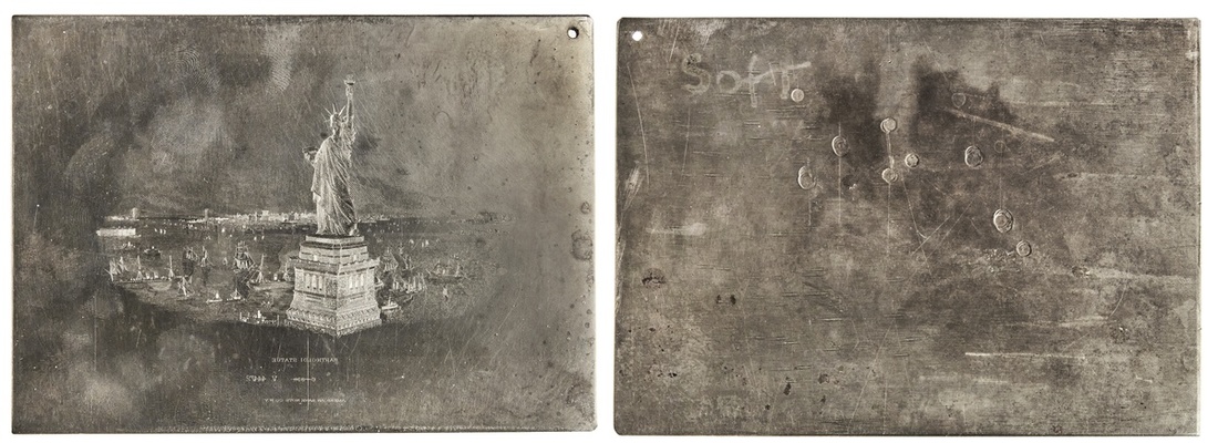ABNC Plate. Statue of Liberty. Steel. 5 ¾ x 4". Imprint of the American Bank Note Company. Detailed view of the colossal icon, ships sailing about, the harbor and downtown Manhattan in the distance. BARTHOLDI STATUE title below. Small hole upper right as made. Bright and lustrous light steel gray with mild toning at edges. Slightly wavy from the production process of being rolled in a cylinder. Deeply engraved. Ex Rich Uhrich Collection, Stack's, Feb. 26-27, 2008, lot 4173.