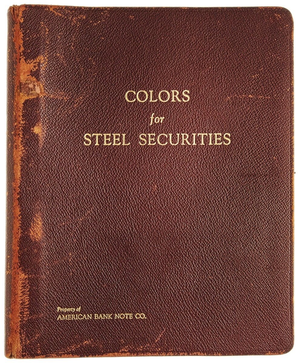 American Bank Note Company Color Chart Book. Six-ring, red leather binder, gold lettered "COLORS for STEEL SECURITIES", "property of AMERICAN BANK NOTE CO." 29 printed pages - 6 7/8 x 8 7/8" -- with color border samples. Same Neo-Classical vignette in black on each. Very scarce. Some scuffing to cover.