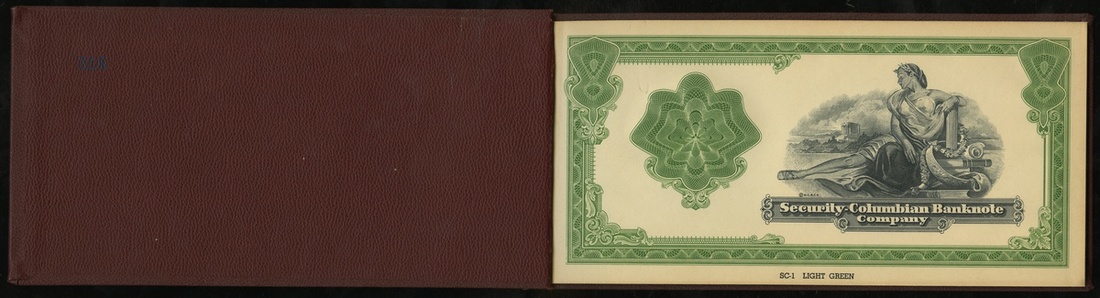 Security-Columbian Banknote Company. Color Sample Book. 8 x 4". 21 colors, each on a portion of a stock certificate. Light green, olive, dark blue, violet, rex orange, rose, etc. Minor usage wear to cover spine. Uncirculated.