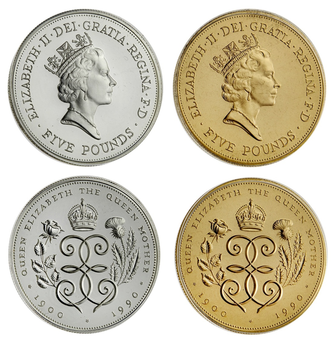 Great Britain. Elizabeth II (1952-). 90th Birthday of the Queen Mother. Proof Gold and Silver 5 Pounds, 1990. Crowned bust right by Maklouf, rev. Crowned cipher double E flanked by a rose and thistle. S.L1; KM 962a, b. Each in case of issue with CoA. Choice Brilliant Proof. (2)