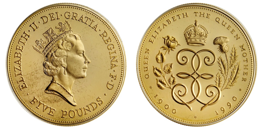 Great Britain. Elizabeth II (1952-). 90th Birthday of the Queen Mother. Proof Gold 5 Pounds, 1990. Crowned bust right by Maklouf, rev. Crowned cipher double E flanked by a rose and thistle. S.L1; KM 962b. In case of issue with CoA. Choice Brilliant Proof.