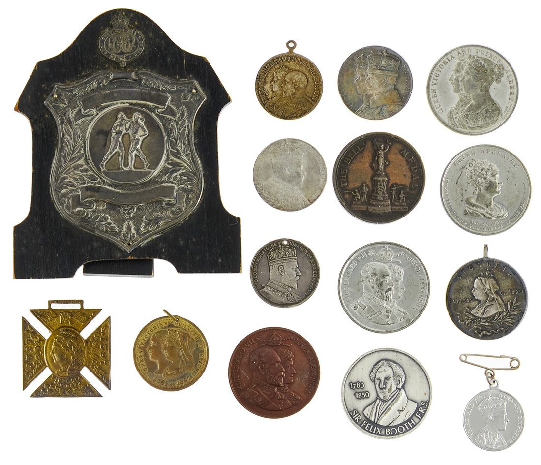 Great Britain. Medley of Medals. William IV/Adelaide, 1830 "Purchasers of the Paul Pry", White Metal, 39mm; Victoria - Royal Visit to Germany, 1845. WM, 39mm; Jubilee, 1897: Australia, AE 30mm, ring loop; brass cross; Memorial 1901, Silver, 34mm, integral loop; Coronation medals --Edward VII, 1902. Official issue, silver 31mm; Silvered AE?, 29mm with integral loop; Rochester, AE and White Metal, 39mm; Natal, silver, 29mm (pierced for suspension); Edward VIII, 1936 - aluminum, 26mm George V Jubilee 1935. Silver, 31mm; Bell Medal, 39mm; and Sir Felix Booth, 1970, .999 Silver, 39mm; also George V. Boxing Award. Silver shield-shaped plaque with pugilists, crowned royal monogram above on blackened wood kickstand. VF-EF. (15)