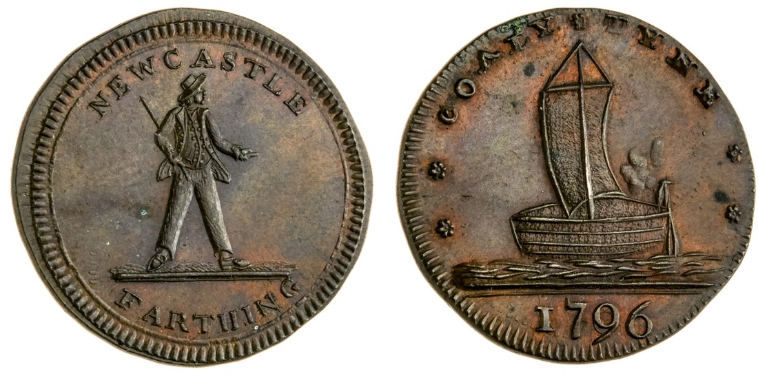 Great Britain. Northumberland. Newcastle. Farthing Token, 1796. Barge a'sail; COALY TYNE, rev. Sailor standing right; NEWCASTLE FARTHING. D&H 28. Uncirculated.
