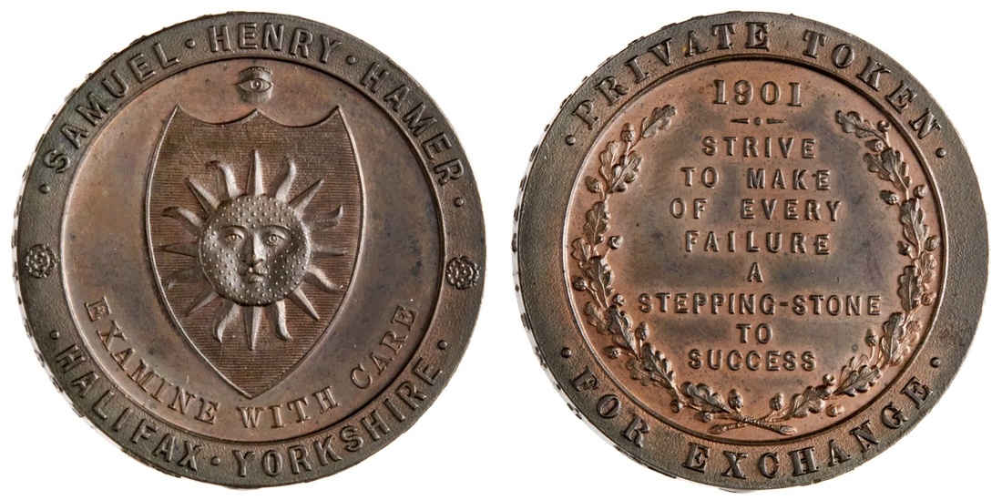 Great Britain. Yorkshire. Halifax. Samuel Henry Hamer. Private Token, 1901. In Copper, 35mm. Sunface on shield, eye above, rev. "Strive to make of every failure a stepping-stone to success" legend within wreath, date above. Cf.Bell, 1966, A7/A6; p.285. Choice Uncirculated and rare.