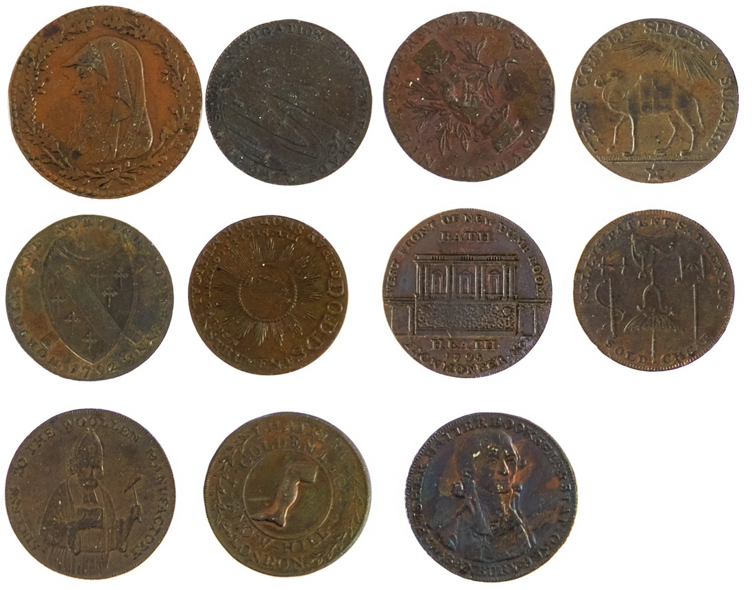 Great Britain. Grouping of 18th Century Merchant Tokens. Halfpennies -- Thomas Hatfield's Golden Legg 1795, Exeter - Bishop Blaise 1792, Banbury - Wm. Rusher Hatter, Kelly's Light harness - London, Bath - Bladud/Heath 1795, Bath - India House 1794, Bishops Stortford-Jackson 1795, Leek Commercial 1793, Norwich 1792, Dodd's - Handel; and Druid-head Penny, 1788. Good VF-Extremely Fine. (11)