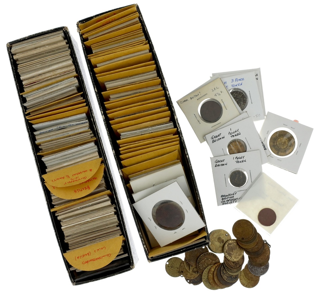 An Array of British Counters and other tokens. Includes a large group of "To Hanover" and related counters; Apothecary weights, a selection of contemporary counterfeit George III Shillings; imitation Spade Guineas and halves; a few coin weights; early 19th Century tokens; some play money and vending tokens; a few counterstamps; and others. Some of the counters holed. Good-Extremely Fine. (193)