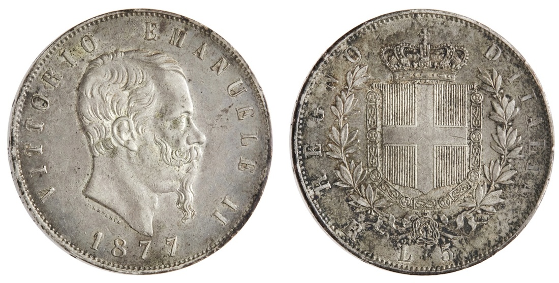 Italy. Kingdom. Vittorio Emanuele II (1861-1878). 5 Lire, 1877 R. Roma. Bare head right, rev. Crowned Arms with Order chain within wreath. KM 8.4. Toned. About Uncirculated.