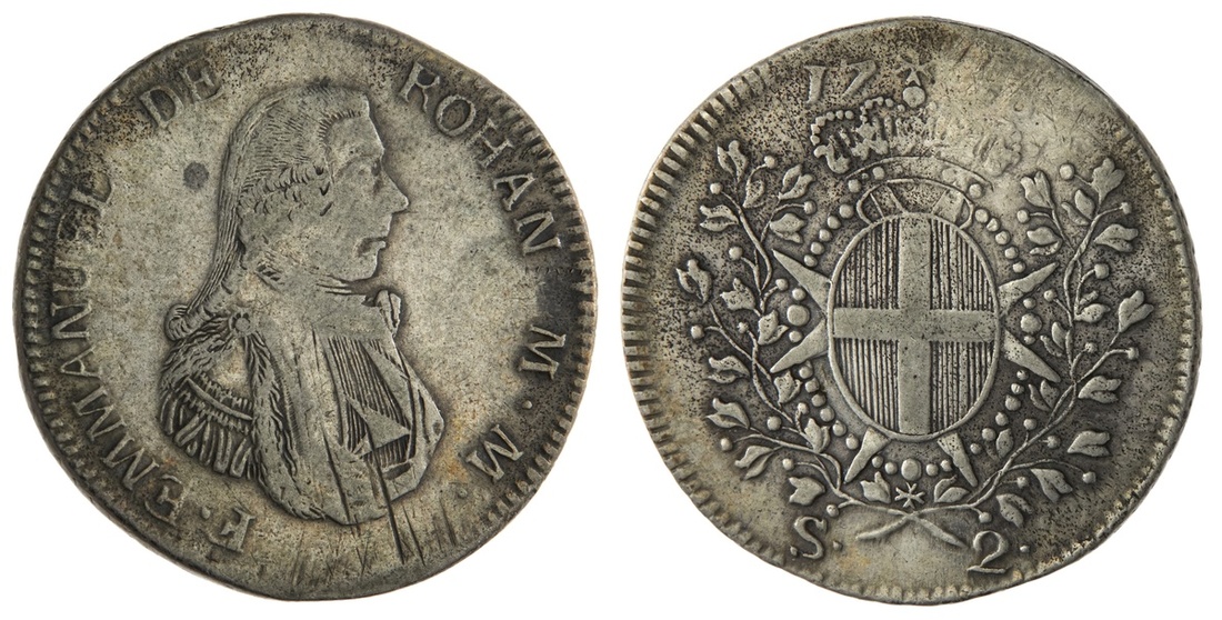 Malta. Sovereign Military Hospitalier Order of St. John of Jerusalem. Emmanuel de Rohan (1775-1797). 2 Scudi, 1796. Armored, draped bust right, rev. Crowned Arms within wreath, value below, date above. KM 343. Adjustment marks from edge occlude third digit of date. About Very Fine.