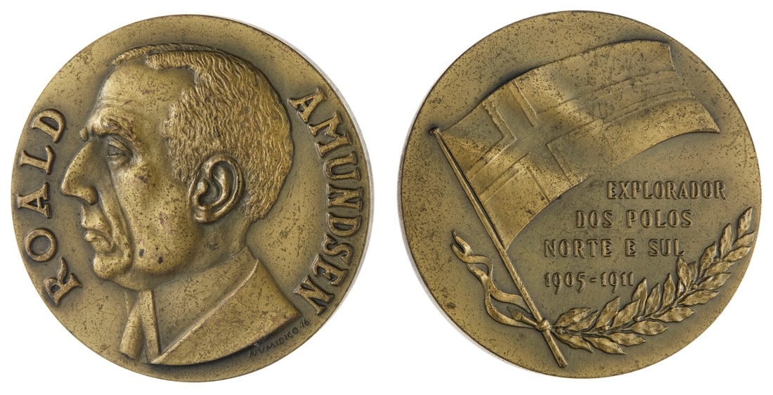 Norway. Roald Amundsen (1872-1928). Tribute Medal, ca. 1970's. Bronze, 68,3mm. No. 226 of 500 pieces struck by Gravarte, Lisbon. Signed "Numidico 76". Bust left, signed below "Numidico 76" rev Norwegian flag and branch; "Explorador Dos Polos Norte E Sul 1905-1911". Surface mottling. Extremely Fine.