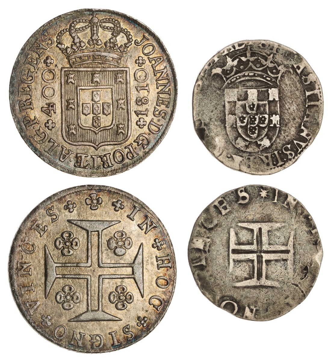 Portugal. Pair of silver issues. Sebastiao (1557-1578). Tostão. Weak peripheries, About VF; João, Prince Regent (1799-1816). 400 Reis, 1810. KM 331. EF-AU. (2)