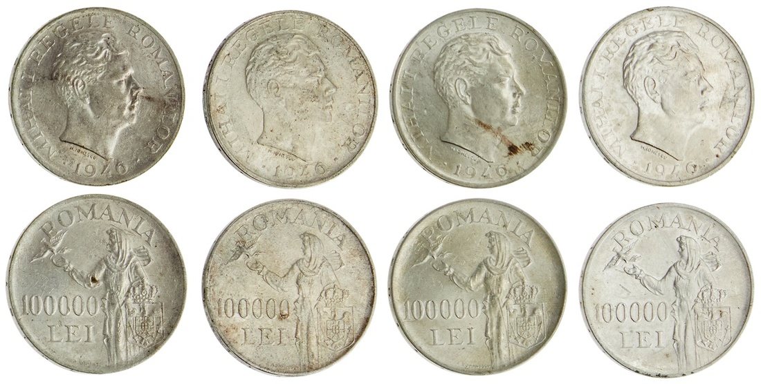 Romania. Mihai I (1940-1947). Quartet of 100,000 Lei, 1946. Had right, rev. Woman standing left, bracing shield and releasing dove. KM 71. AU-Uncirculated. (4).