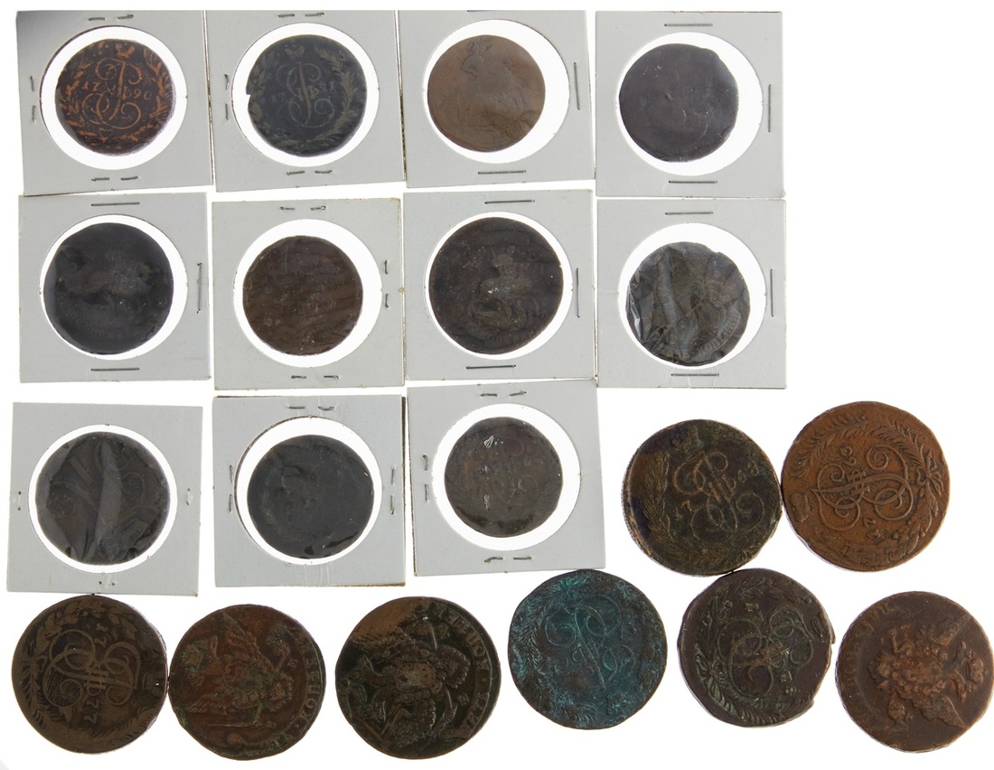 Russia. Elizabeth-Paul. 18th Century Copper Coinage. Includes: 5 Kopeks, 1768 MM; 1763 C?M; 1768, 1771, 1773, 1777, 1778, 1788; 2 Kopeks, 1758, 1759, 1763; 1765 C?M; 1763, 1765, 1789, 1790, 1791 EM; 1798 AM; Kopek, 1756 C?? - undertype clearly visible. A few with some deposits, VG-VF. (19)