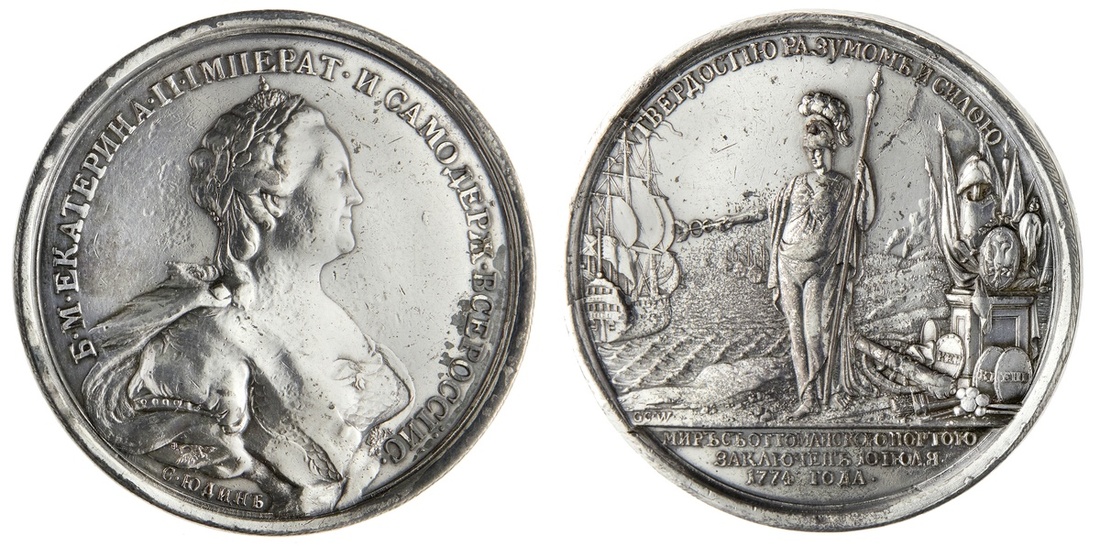 Russia. Catherine II, the Great (1762-1796). On the Peace with Turkey. Medal. Silver, 52mm. By S. Yudin. 60.07 gms. Crowned and mantled Catherine II bust right, signed below, rev. Pallas-Athena standing ¾ left, holding spear and pointing caduceus at warship, military trophies beside her, other ships in the distance. Diakov 165.4 (R3). Rare. Hairlines in fields. Polished. Extremely Fine Details.