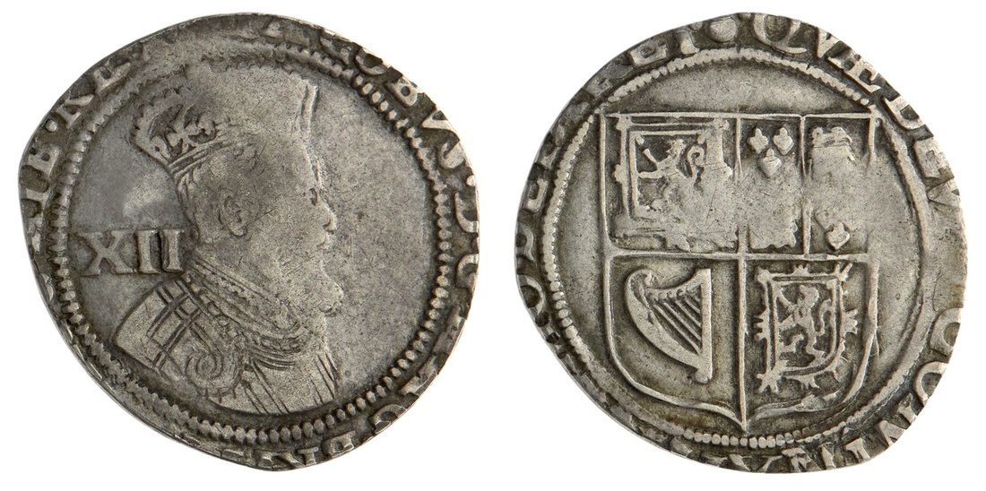 Scotland. James VI (James I of England), 1567-1625. After his Accession to the English Throne. Shilling. 4.6 gms. Crowned bust right, XII behind, rev. Shield with the Scottish Arms in the first and fourth quarters. S.5506. Clipped. Weakness at obverse center. About Very Fine.