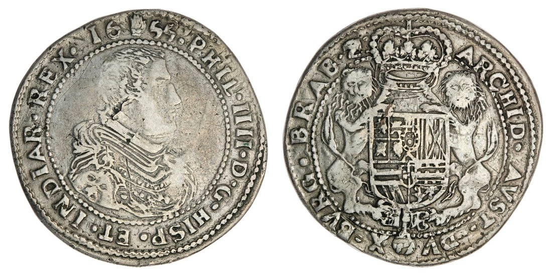 Spanish Netherlands. Brabant. Philip IV (1621-1665). Ducaton, 1655, mm hand. Antwerp. 31.9 gms. Armored bust right, rev. Crowned Arms supported by lions. Dav.4454, KM 72.1. Small obverse flan flaws, and some hairlines. Very Fine.