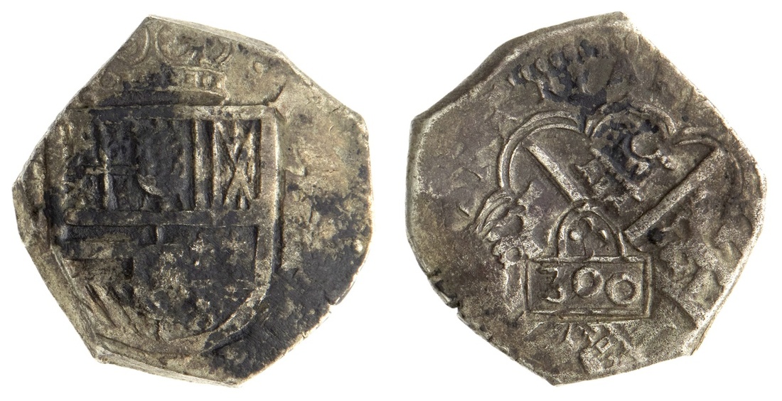 Brazil. Afonso VI (1656-1667). Countermarked Coinage. 300 Reis (1663). 13.22 gms. Crowned "300" in cartouche c/m on the reverse of a Spanish Colonial 8 Reales Cob. Crown flanked by two pellets, domed arc, extra tiny pellet within dome right. KM 18.1. Light obverse stain. Host Very Fine, c/m Good Very Fine.