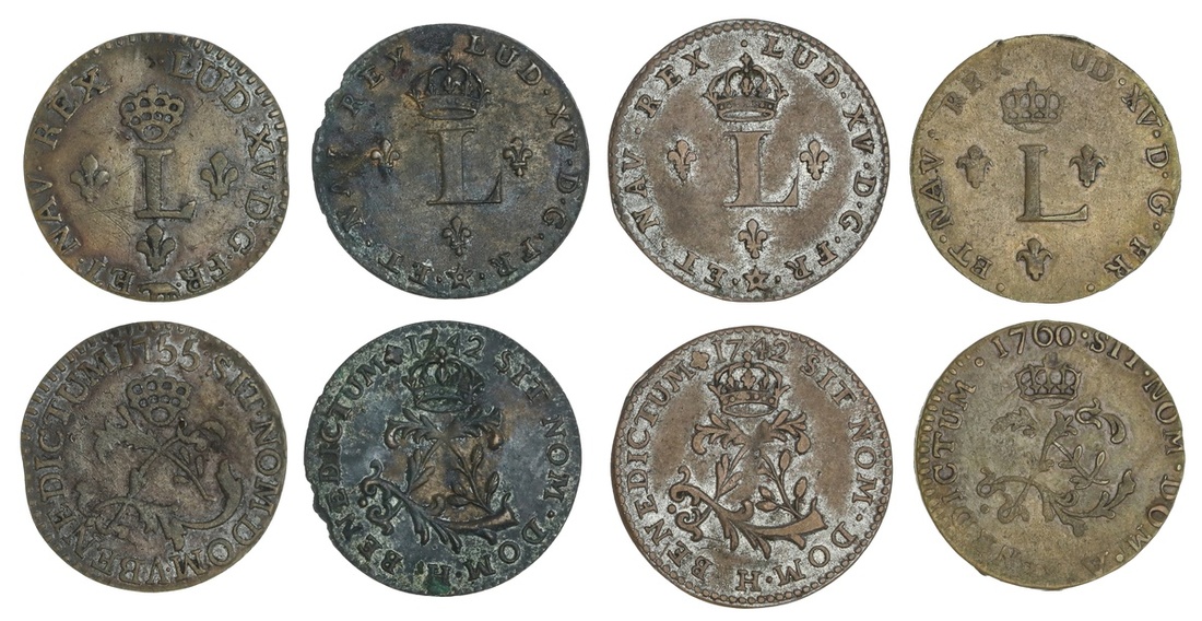 French New World. Louis XV (1715-1774). Quartet of contemporary counterfeit Sou Marque (Double Sol): 1742 H (2). One with minor die flaw; 1755 A (as an inverted V). A few digs and test scratches; and 1760 A. Vlack 358, 347, 354. Extremely Fine. (4)