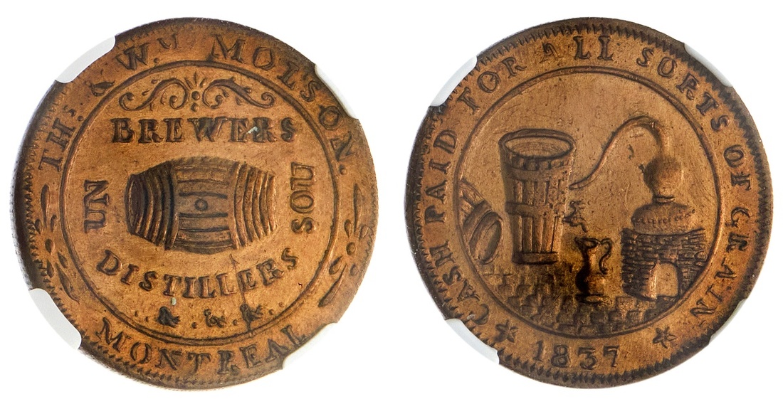 Lower Canada. Montreal. Molson Brewers & Distillers. Sou (Halfpenny) Token, 1837. Beer cask within circle, rev. Distillery equipment within circle. Breton 562, LC 16. NGC AU Details - cleaned.