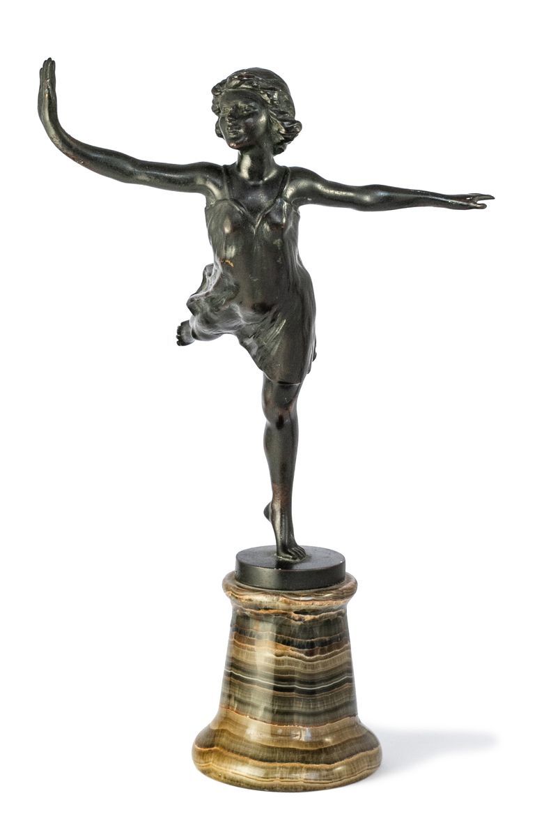 Stephen Schwartz. "Dancing Girl". Ca. 1910. Bronze cast set on a marble base. 10 ½" high, 7" wide, diameter: 6 ½". Signed: "St. Schwartz Austria" on base. Ex Carleton Collection.