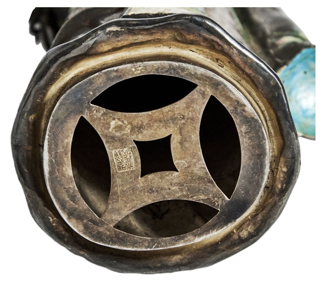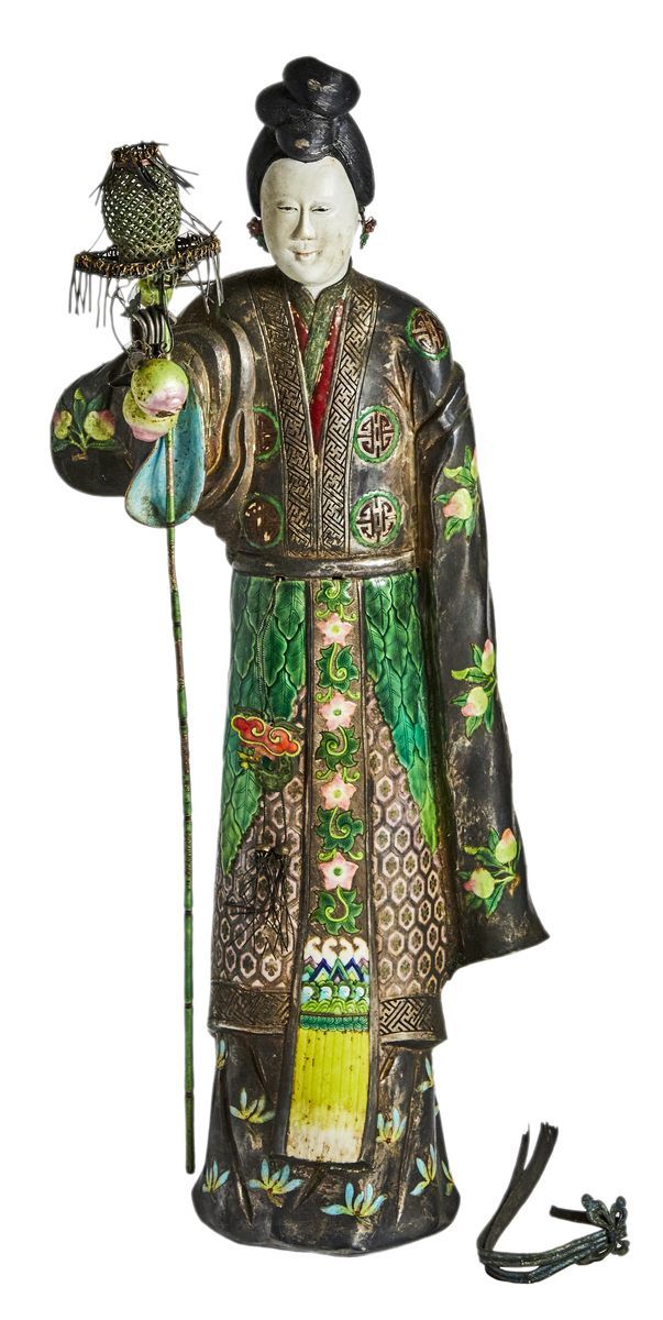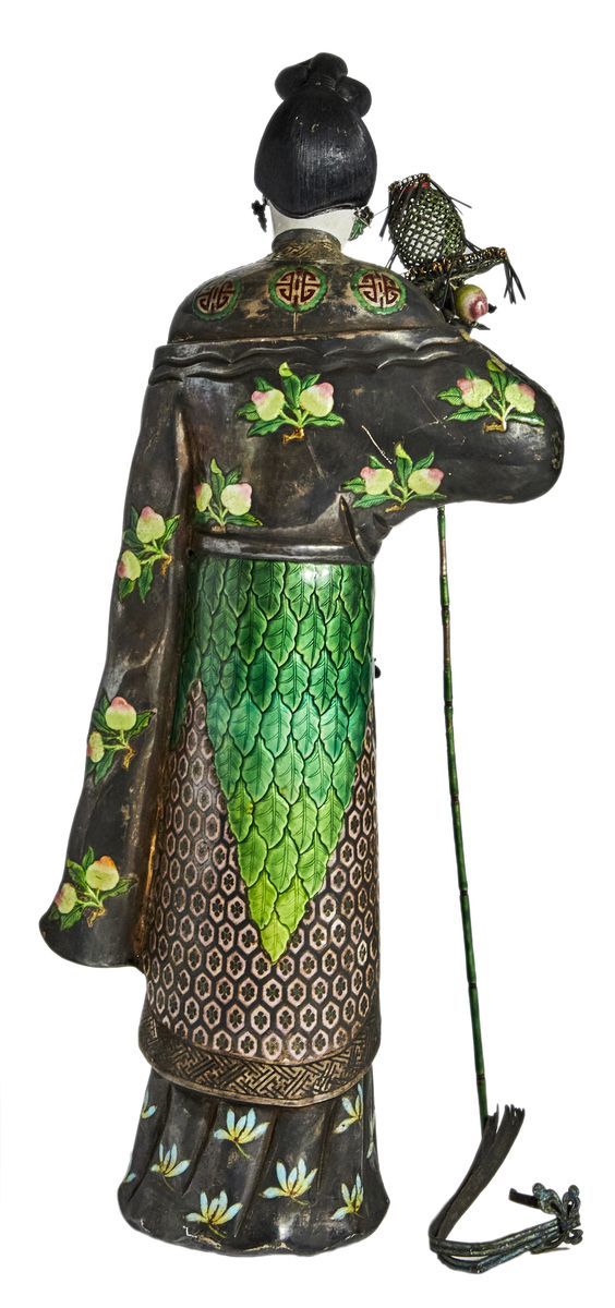 Large Chinese Silver and Enamel Figure of Lan Caihe, one of the Eight Immortals. 19th-early 20th Century. 17" high (43.18 cm). Lan Caihe, often considered the Patron of Florists, wears a long robe adorned with pink, light green and light blue enameled flowers with green enamel stems and stalks, an enameled badge on his belt, he holds a green-enameled pole supporting a flower, fruit basket. Chinese character mark on the bottom. The delicate wire holding the basket to the pole and the ribbon has separated - but all pieces are there and intact. Fine workmanship.