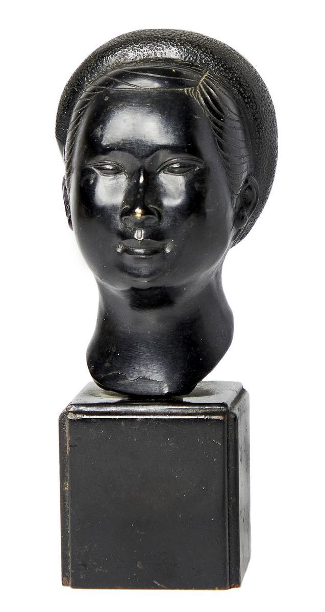 Vietnamese Bronze Bust of a Young Woman. By Nguyen Thanh Le. Ca. 1947-1960. 5" high, on black wood base, 7 ¼" total high. Patinated black. Signed on back. Old adhesion stain on side of base.