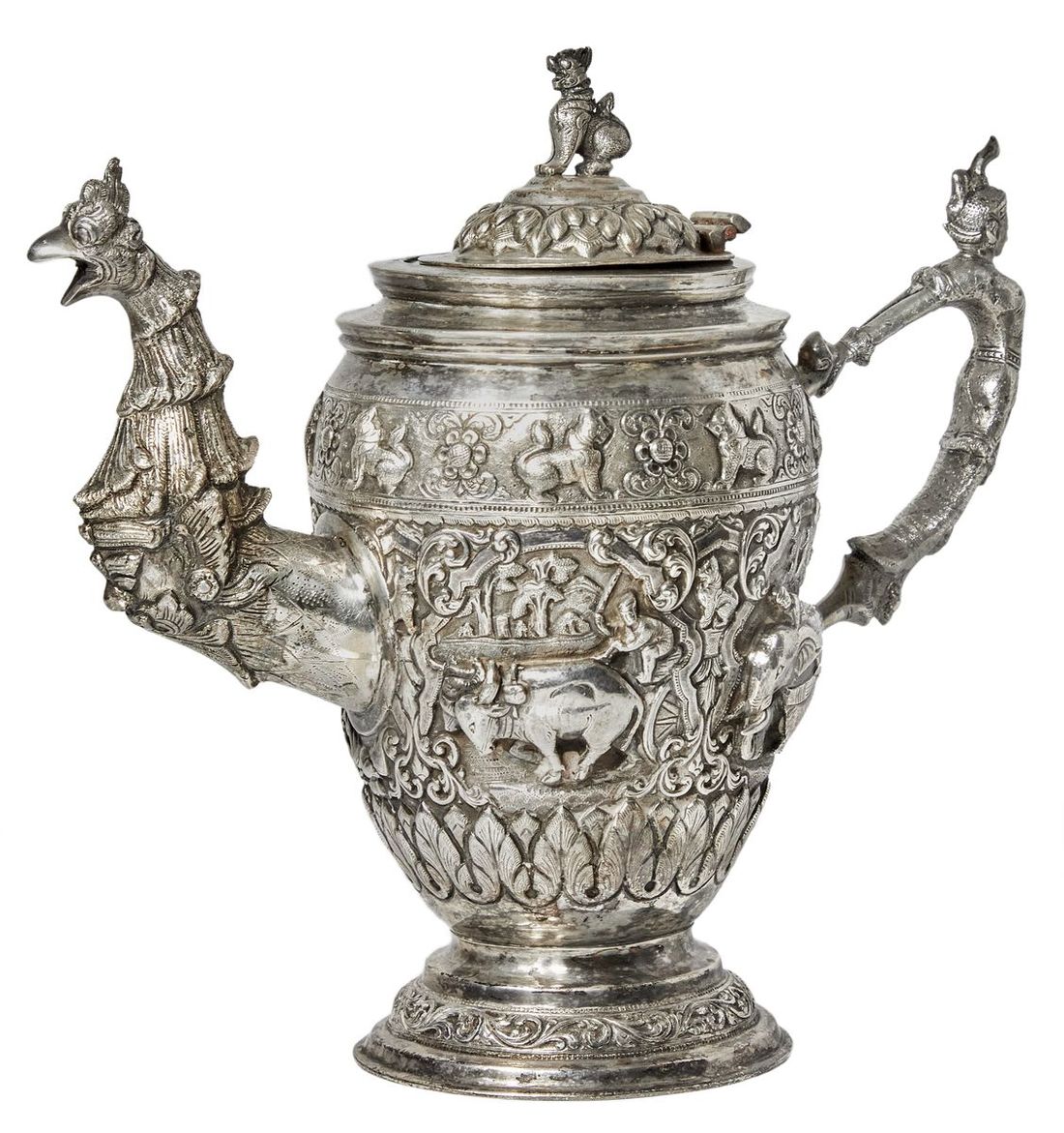 Ornate Burmese Silver Repoussé Coffee Pot. Early 20th Century. 9 ¼" high. 2 lbs 13.2 oz. Companion piece to above. Intricately cast, chased and engraved with high-relief figures of an elephant and mahout, farmer driving a oxen-pulled cart, and a man in a small boat, pattern of chinthe around above; sacred duck -- hin-tha (hamsa) spout, figural handle, lid capped by the Chinthe - Burmese lion. Stamped "95/SILVER BURMA" on bottom. Lid has separated, otherwise very fine.