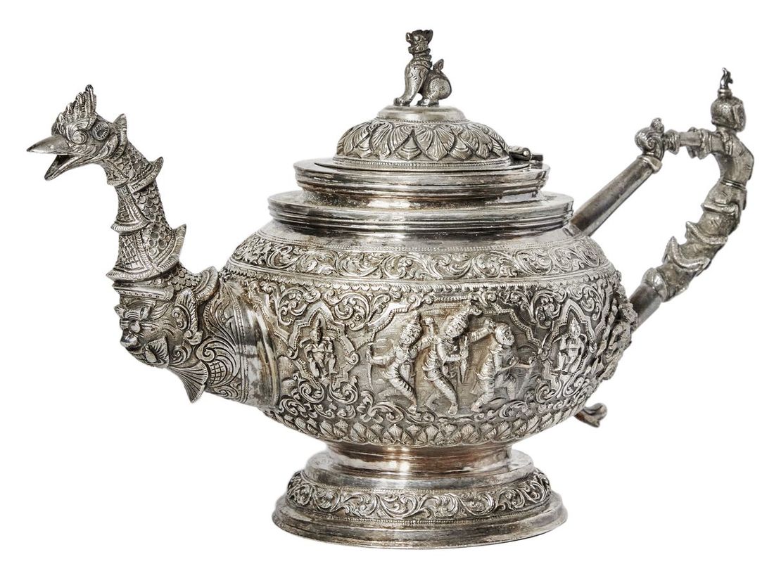 Burmese Silver Repoussé Tea Pot. Early 20th Century. 7" high. 2 lbs 14.2 oz. Ornately cast, chased and engraved with high-relief figures from the Jataka. Sacred duck -- hin-tha (hamsa) spout, figural handle, lid capped by the Chinthe - Burmese lion. Stamped "95/SILVER BURMA" on bottom. Handsome.