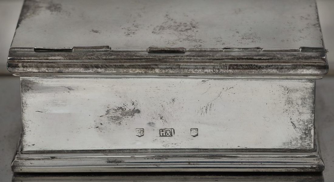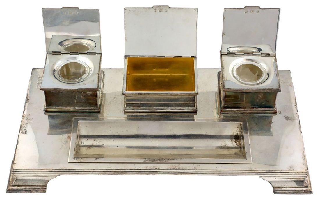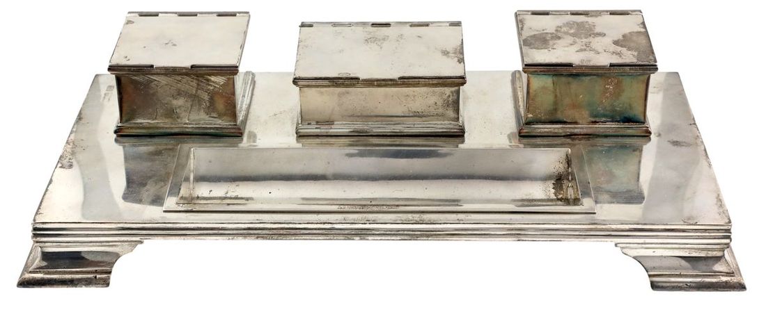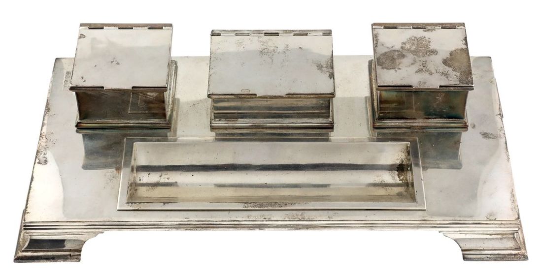 B>Sterling Silver Desk Set. By Hamilton & Inches, Edinburgh. C. Late 1800's-early 1900's. Two inkwells flank card case, pen-quill slot in front; footed stand, all components hallmarked. 47.2 oz.