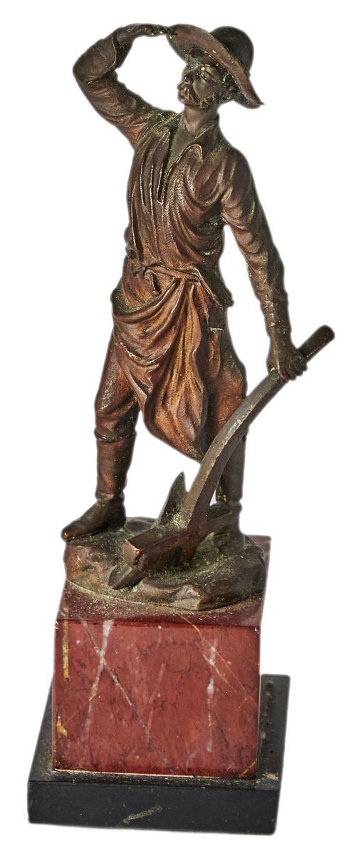 Bronze Figure of a Farmer. Signed Canisius. Ca. 1920-1930. 5" high, on a red marble plinth, total height 6 7/8". Farmer wearing wide-brimmed hat, tunic and boots, holding hoe, and looking in the distance.