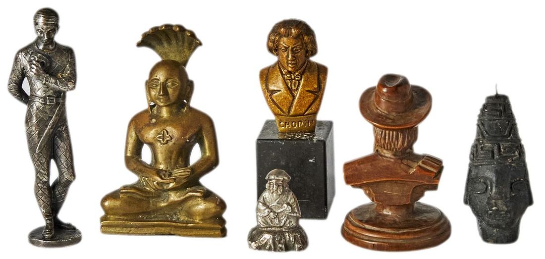 Small Figures and Busts. Includes: Small 1 ¾" bronze bust of Chopin on a black plinth; Silvered Brass figure of a Renaissance Attendee at a masked ball, holding his mask to his chest and his hat behind his back. 3 ½" high; German miniature bust of Friedrich Hecker, hero of the 1848 Uprising in Baden. Wood, 2 ½" high. 19th-early 20th Century; Chinese Silver Temple Figure. 1 1/8" high; Asian Bronze Monk in half-lotus seated position, fan behind. 2 7/8" high; and Southeast Asian head with conical helmet. Soft stone, loop top wear as a pendant. (6)