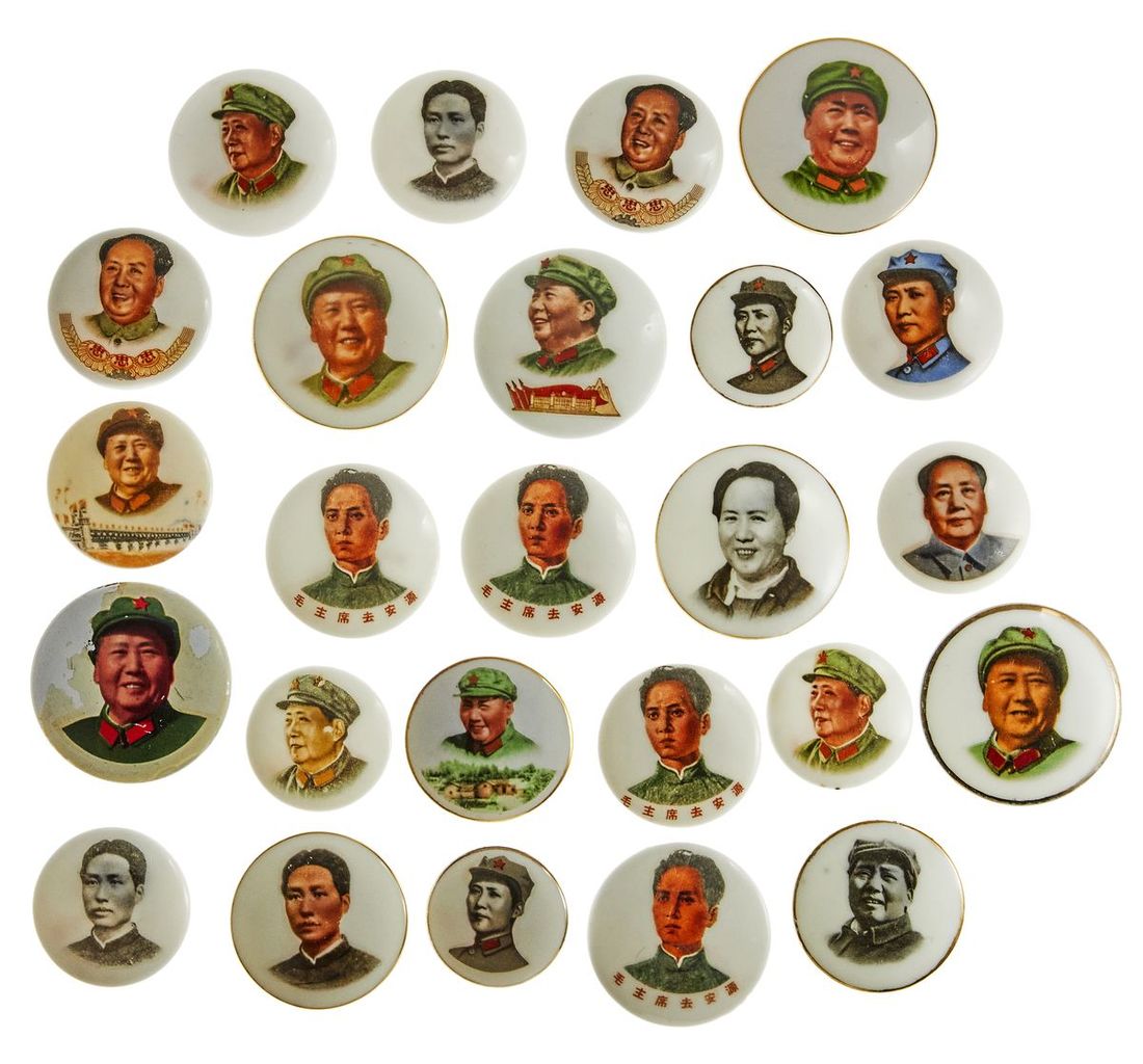 Lot of Porcelain Chairman Mao Pinback Badges (25). China, early Cultural Revolution Period 1960s. 1 1/3 to 2". Various portraits of Mao Zedong at different points in his life - from a young man to elder leader - in color and black and white. A few with some chips. (25)