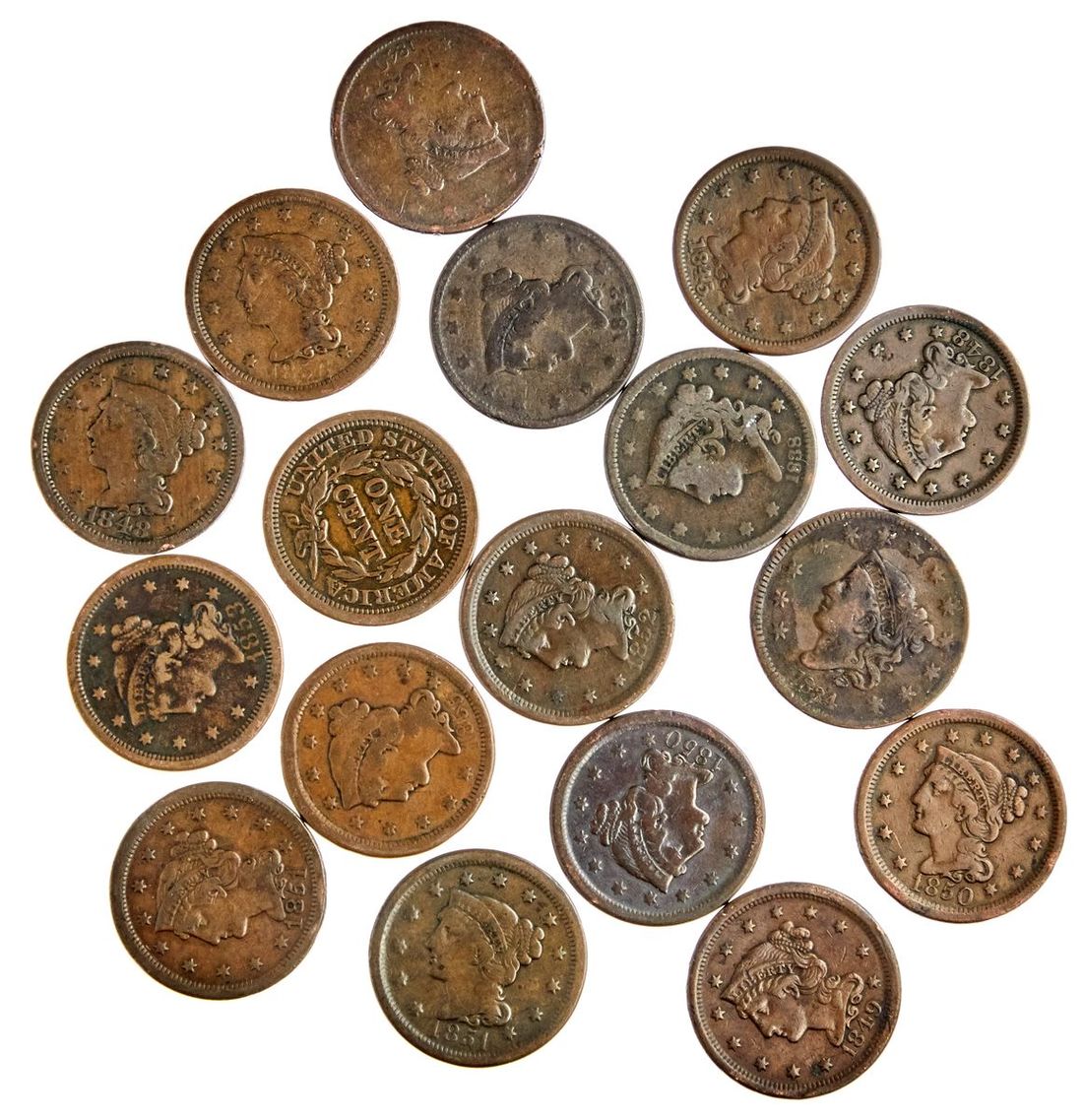 Lot of Large Cents. 1834, 1838, 1840, 1842, 1845, 1848 (2), 1849, 1850 (2), 1851 (2), 1852 (2), 1853, 1855, 1856. A few once lightly wiped or cleaned. VG-VF. Decent coins. (17)
