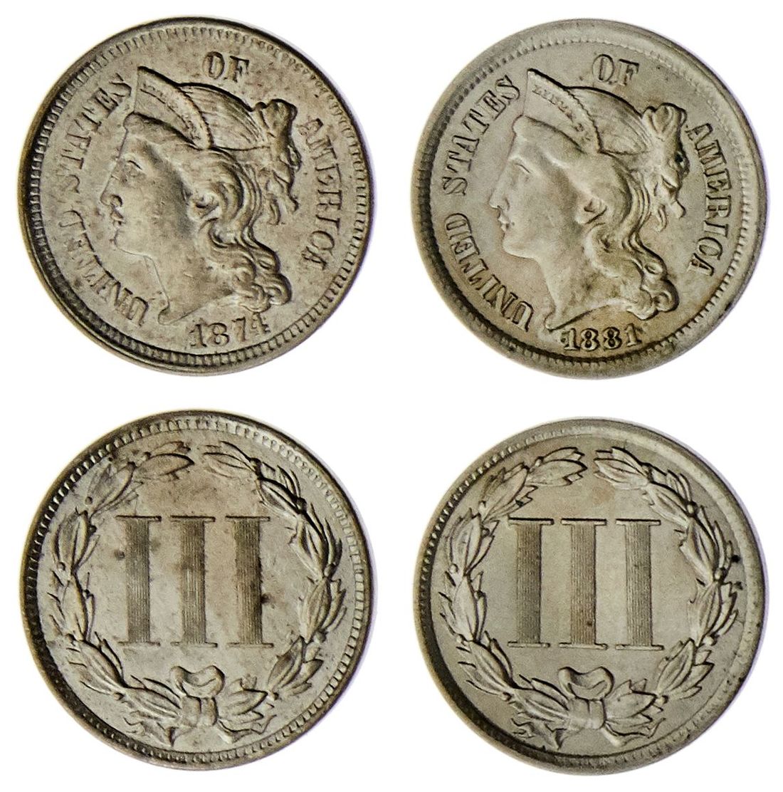 Pair of Three Cents Nickels. 1874. Uncirculated; and 1881. EF. (2)