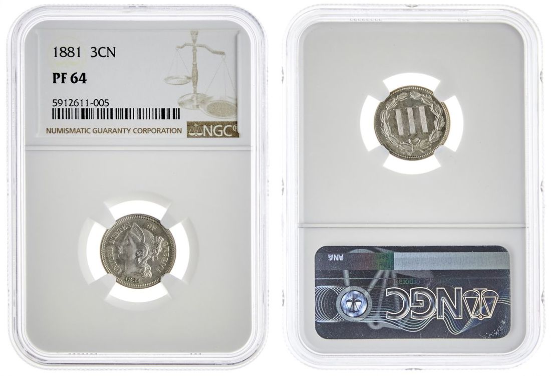 1881 Proof Three Cent Nickel. NGC PF 64.