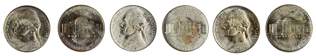 Trio of High-grade Jefferson Wartime Silver Alloy Nickels. 1943-S (2), and 1945-S. All NGC MS 67. (3)