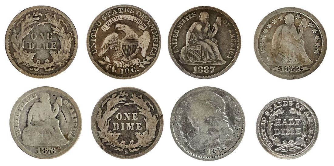 Assortment of Capped Bust and Liberty Seated Dimes . 1834 Good, 1835 Fine; 1853 arrows Fine, 1872 About VF, 1876-CC Good, 1887 Fine-About VF, 1889-S VG; also Half Dime, 1854 arrows. Cleaned. EF Details. (8)