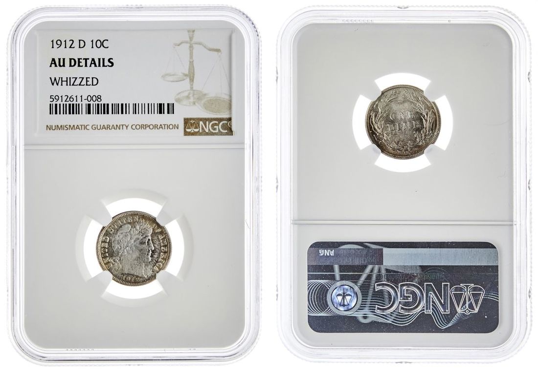 1912-D Barber Dime. NGC AU Details -whizzed.