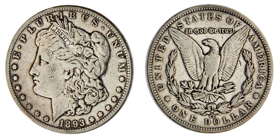 1893-CC Morgan Dollar. Once wiped. About Very Fine.