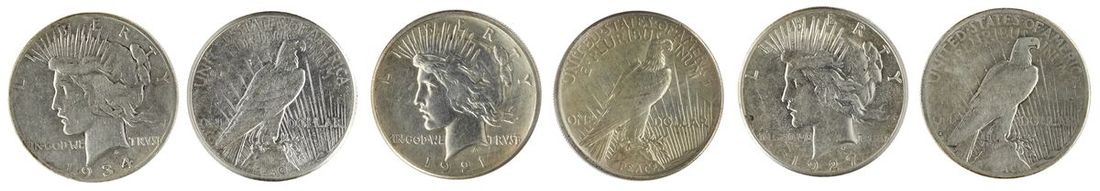 Peace Dollar Trio. 1921. Cleaned, hairlines. VF details; 1927. EF; and 1934-S. Fine. (3)