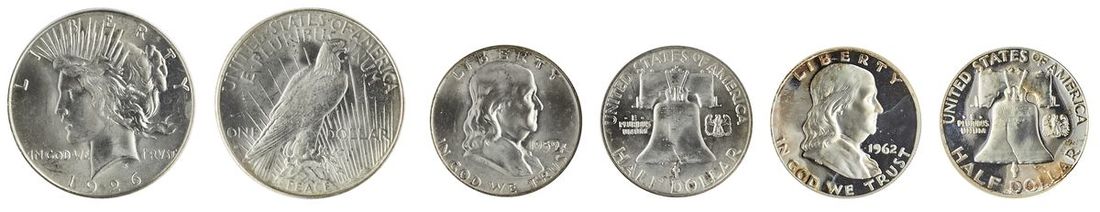 1926-S Peace Dollar. PCGS MS 63 and Franklin Half Dollars. 1959-D ANACS MS 65, 1962 ANACS PF 66 Cameo. (3)