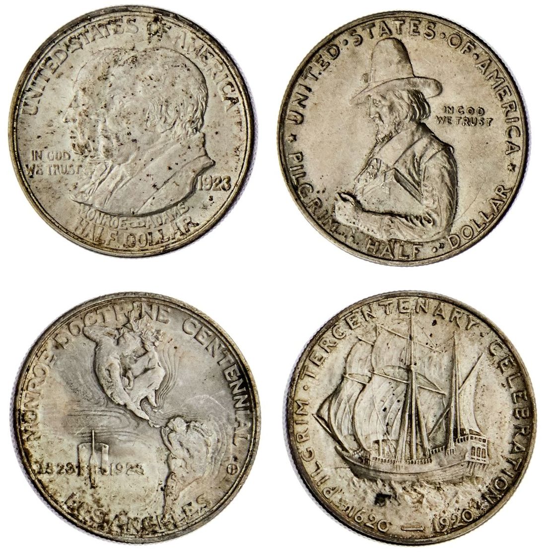Pair of Commemorative Half Dollars. 1920 Pilgrim; and 1923-S Monroe. The latter with speckled toning. Uncirculated. (2)